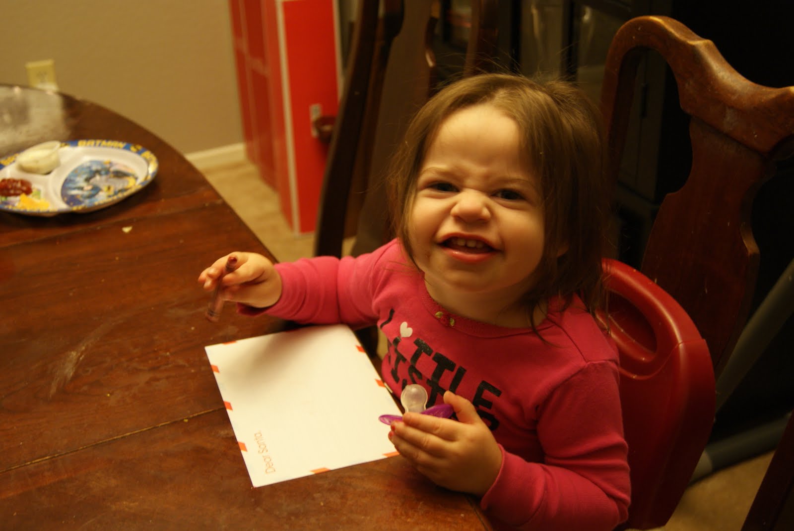 Anyways tonight we wrote our letters to Santa. I let each of them "write" their own letter. Dublin told us we weren't aloud to know what he wants this year, only Santa can know ha ha. While he was "writing" his letter he was whispering what he was writing, and apparently he wants a snow globe and a T-Rex. Good to know.